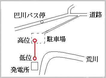 発電所に向かう脇道が存在し、その行き止まり地点に駐車場が存在する。そこから低位(南)の発電所に向かって軌道が延びている。
